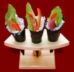 Ингредиенты: тонкая морковь, 180 г. стручки гороха сахарного, 180 г. крупные креветки, 120 г. редька конусная, 3 шт. соевый соус, 2 ч.л. майонез, 4 ст. л. мирин 2 ст.л. приготовленный рис для суши, 180 г. лист нори, 3 шт. васаби Приготовление: 1. Стручки сахарного гороха очистить, помыть и разрезать вдоль пополам. Очистить морковь и редьку. Разрезать морковь вдоль, а редьку тонкими полосками длиной примерно 7 см и толщиной 0,5 см и посолить. 2. Стручки гороха и морковь опустить в кипящую воду на 1 минуту и откинуть на дуршлаг. 3. Овощи перемешать и разделить на 6 порций. Майонез взбить с соевым соусом. Подержать креветки в мирине около 10 минут. 4. Мокрыми руками сделать из риса суши 6 овальных темаки. 5. Разрезать листы нори пополам. Половину листа кладем на левую рук так, чтобы гладкая сторона была обращена вниз. В верхней части листа располагаем рис суши, смазав его васаби. Укладываем креветки и овощи, поливаем смесью майонеза и соевого соуса, слегка сжимаем и сворачиваем лист нори в кулечек.